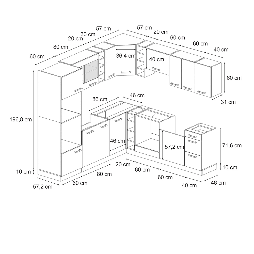- MAßE: Die Küche L Form hat eine Breite von 227×287 cm, eine Höhe von 207 cm und eine Tiefe von 46 cm. Alle detaillierten Größen sind auf den Fotos angegeben.