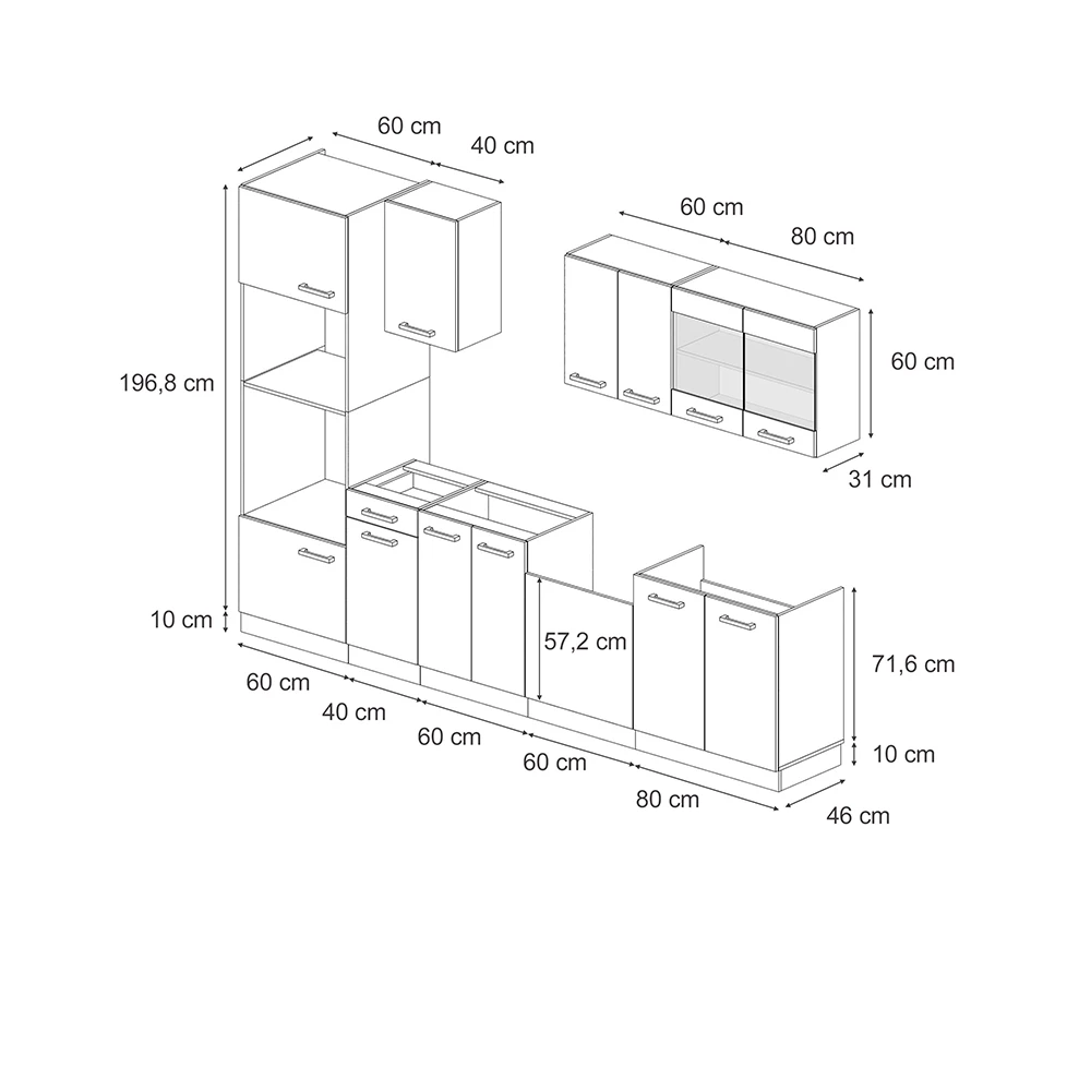 - MAßE: Der Küchenblock, mit Hochschrank, ohne Arbeitsplatte, hat folgende Maße: Tiefe: 46 cm, Breite: 300 cm, Höhe: 207 cm