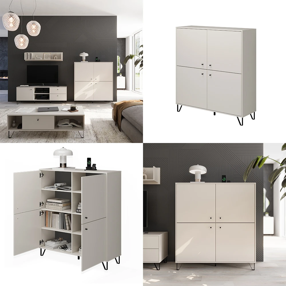 Das Sideboard Aldo bringt mit seinem originellen Design einen Hauch von Individualität in Ihr Zuhause. Mit insgesamt vier Türen bietet es reichlich Stauraum und ist sowohl für das Wohn- als auch für das Schlafzimmer ideal geeignet. Doch das Beste: Das Aldo Sideboard ist Teil einer ganzen Reihe von Möbeln, die perfekt aufeinander abgestimmt sind und somit ein einheitliches Designkonzept ermöglichen. Als Kommodenschrank mit Türen wird das Aldo Sideboard zu einem Multifunktionsmöbel, das in keinem modernen Zuhause fehlen sollte. Bringen Sie mit dem Sideboard Aldo neuen Schwung in Ihre Einrichtung und erfreuen Sie sich an seinem praktischen Nutzen!