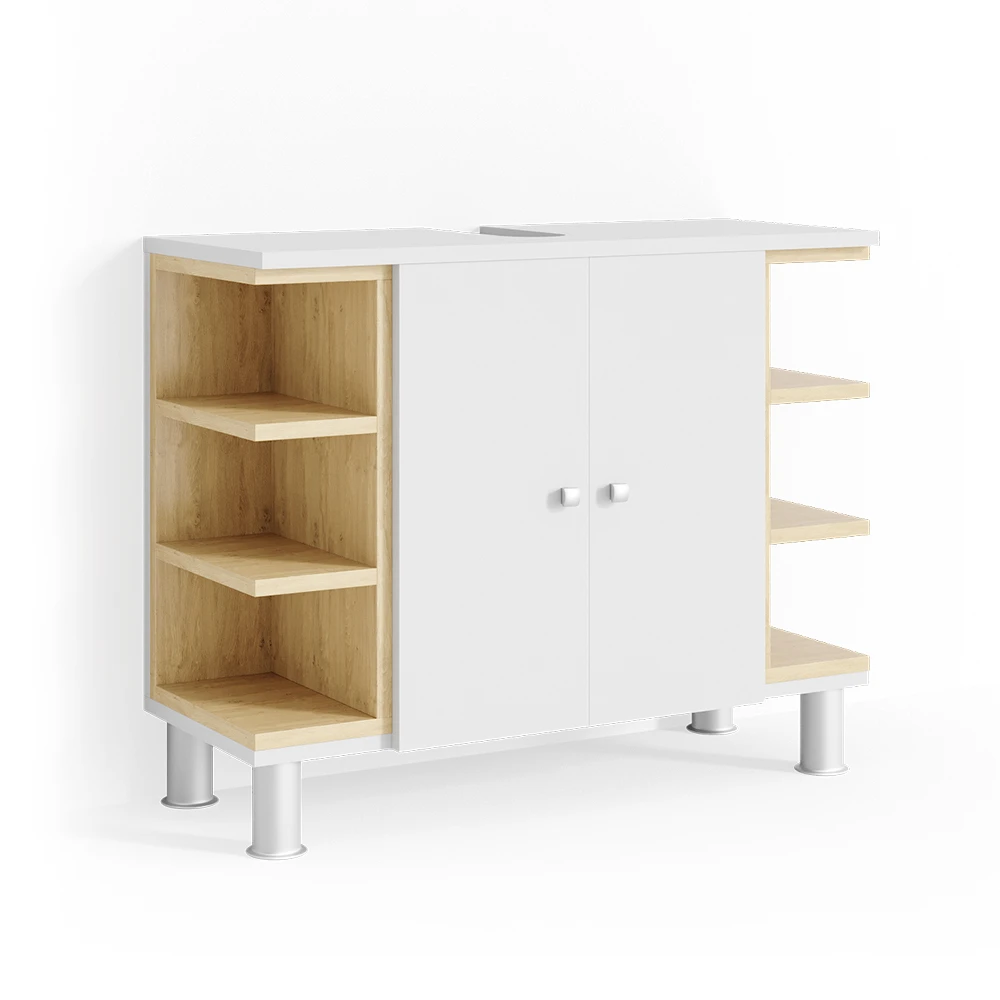 - Der Waschtischunterschrank hat zwei Flügeltüren und sechs offene Einlegeböden. Für einen Siphon ist eine Aussparung vorhanden. Die Füße des Möbelstücks sind aus Metall.