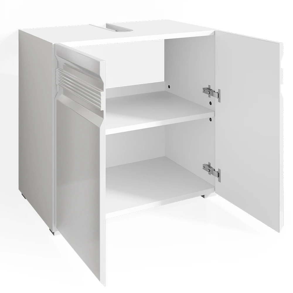 - Dieser Waschtischunterschrank hat zwei Flügeltüren und eine Aussparung für den Siphon. Er ist grifflos.