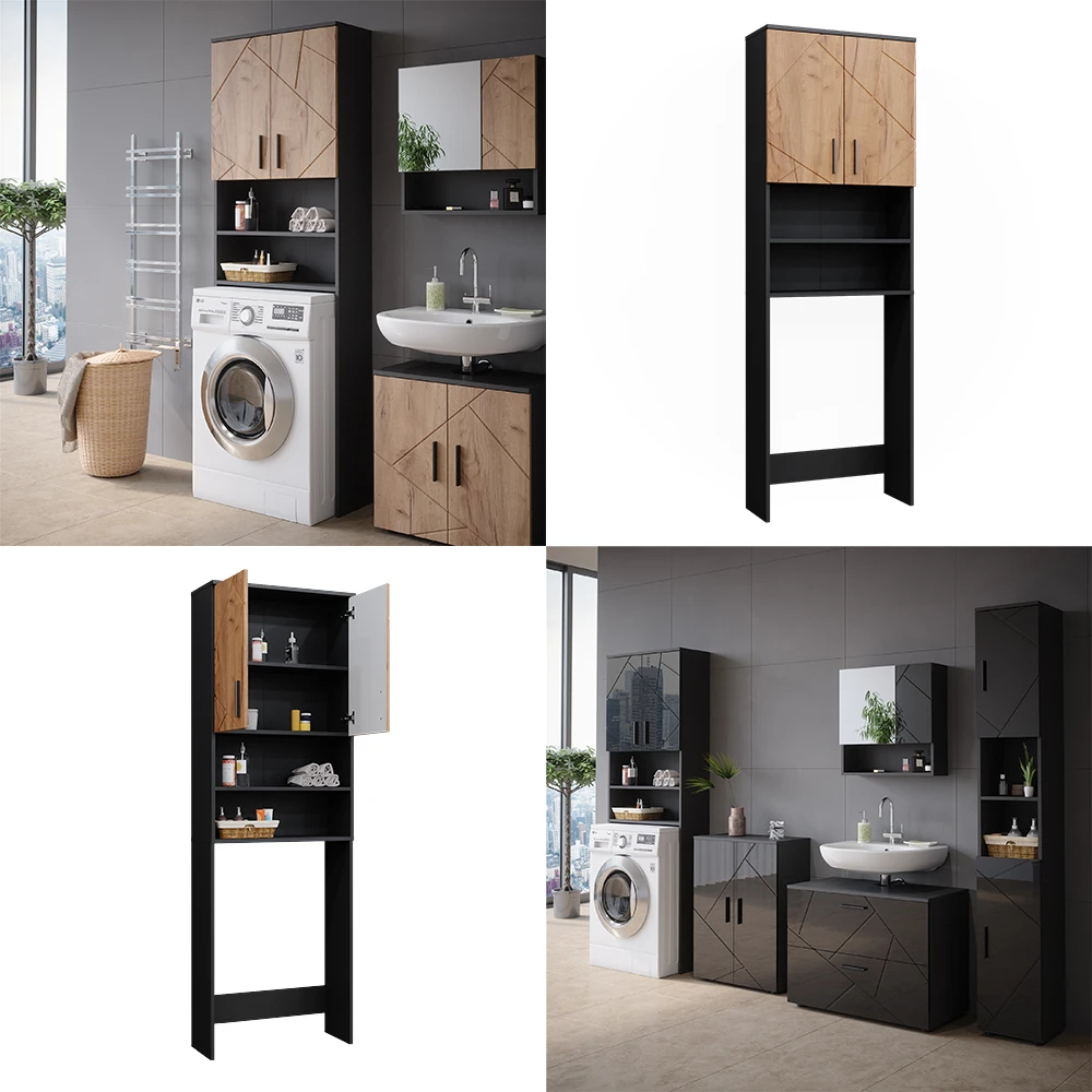 - Das Badmöbel bietet offene Ablagen und geräumige geschlossene Fächer sowie eine Öffnung für die Waschmaschine. Es ist praktisch und funktional für das Bad.