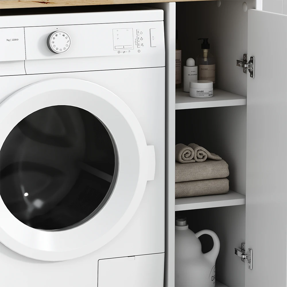 Unser Waschmaschinenschrank überzeugt mit einem modernen Design, klaren Linien und Details, die Ihrem Badezimmer einen stilvollen Touch verleihen. Mit nur einer Tür und drei geräumigen Fächern bietet der Schrank ausreichend Stauraum, um Ihre Utensilien ordentlich zu organisieren. Die Oberfläche ist pflegeleicht, sodass Sie sie mühelos sauber halten können. Die Montage gestaltet sich kinderleicht und unkompliziert, damit Sie schnell von den Vorzügen des Schranks profitieren können.