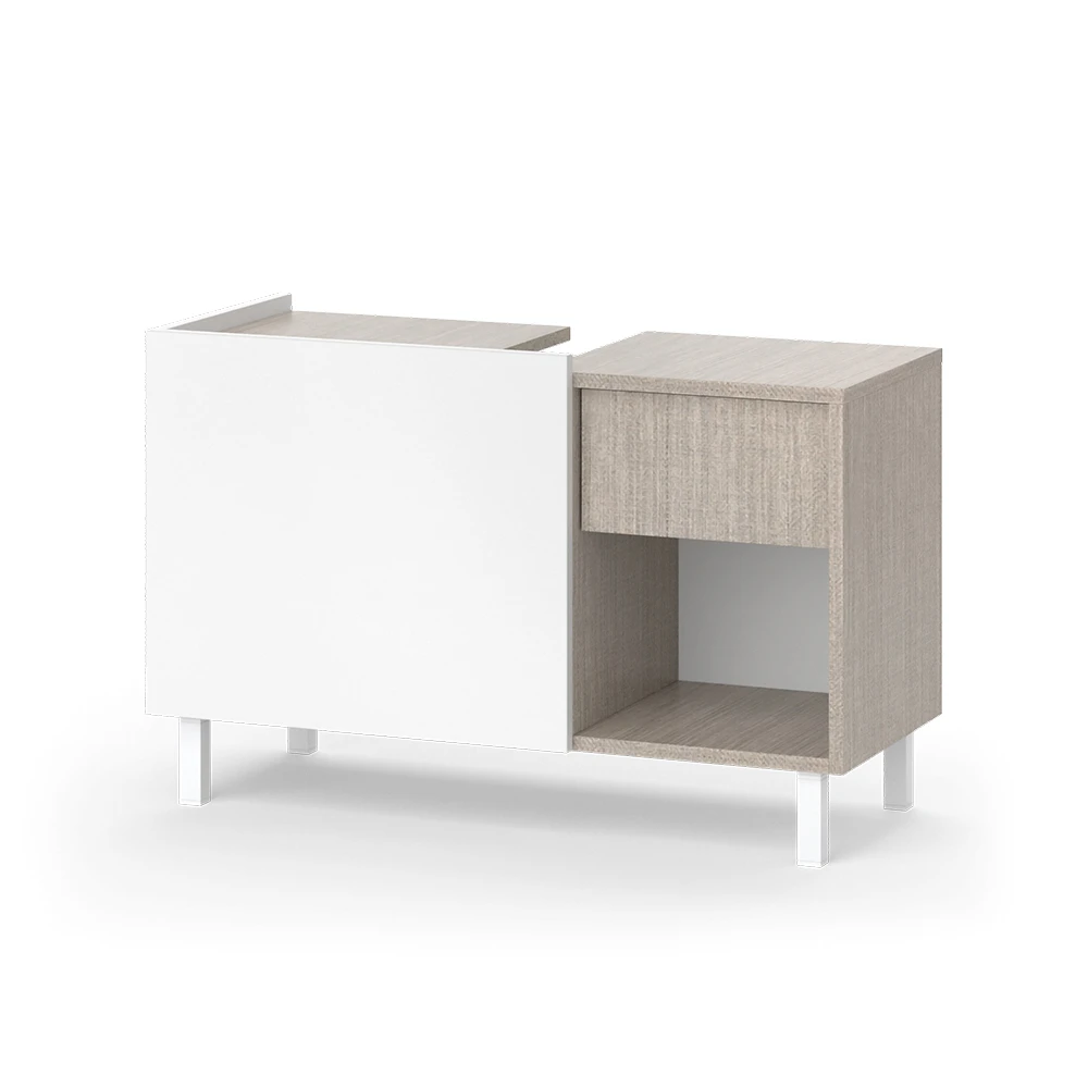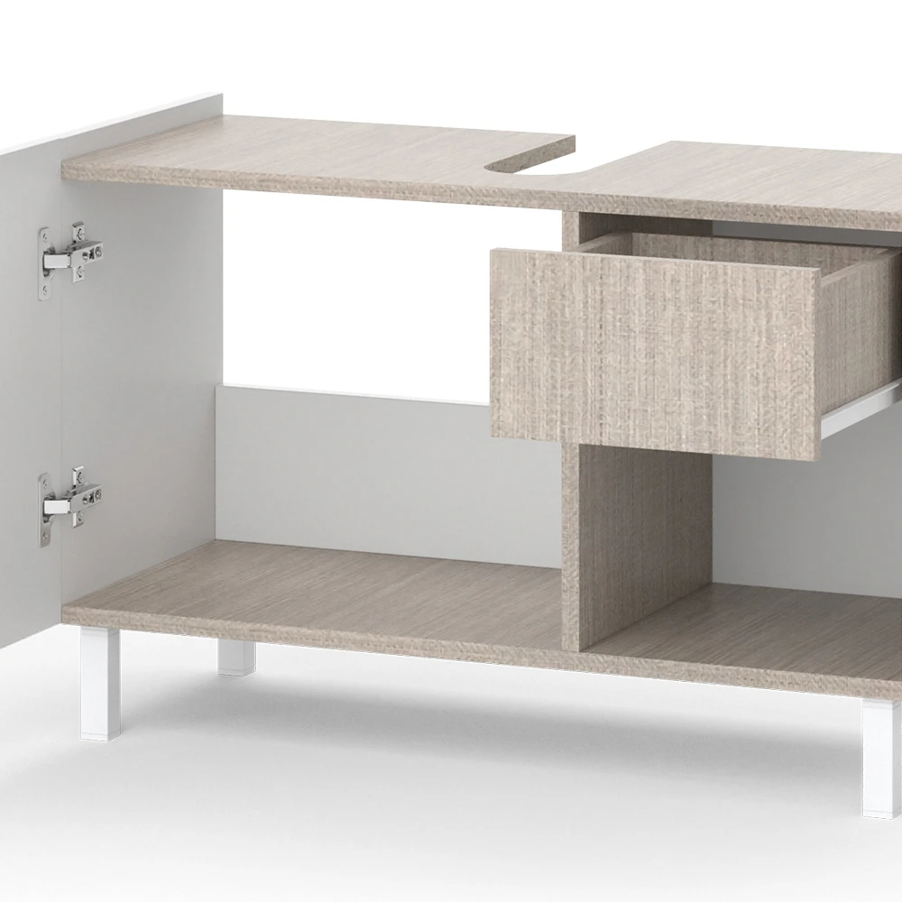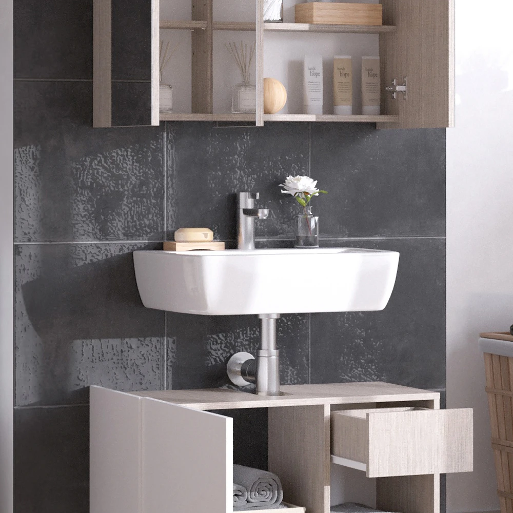 Mit seinem modernen, zweifarbigen Design ist dieser Waschtischunterschrank ein Blickfang in Ihrem Badezimmer. Dieser Waschtischunterschrank ist Teil der Arianna-Serie und integriert sich mühelos in Ihr Gesamtkonzept. Die pflegeleichte Oberfläche sorgt dafür, dass Ihr Badmöbelstück stets makellos aussieht und einfach zu reinigen ist. Die Montage gestaltet sich unkompliziert, dank der beigefügten Anleitung, und Sie können Ihren neuen Badunterschrank schnell in Betrieb nehmen.