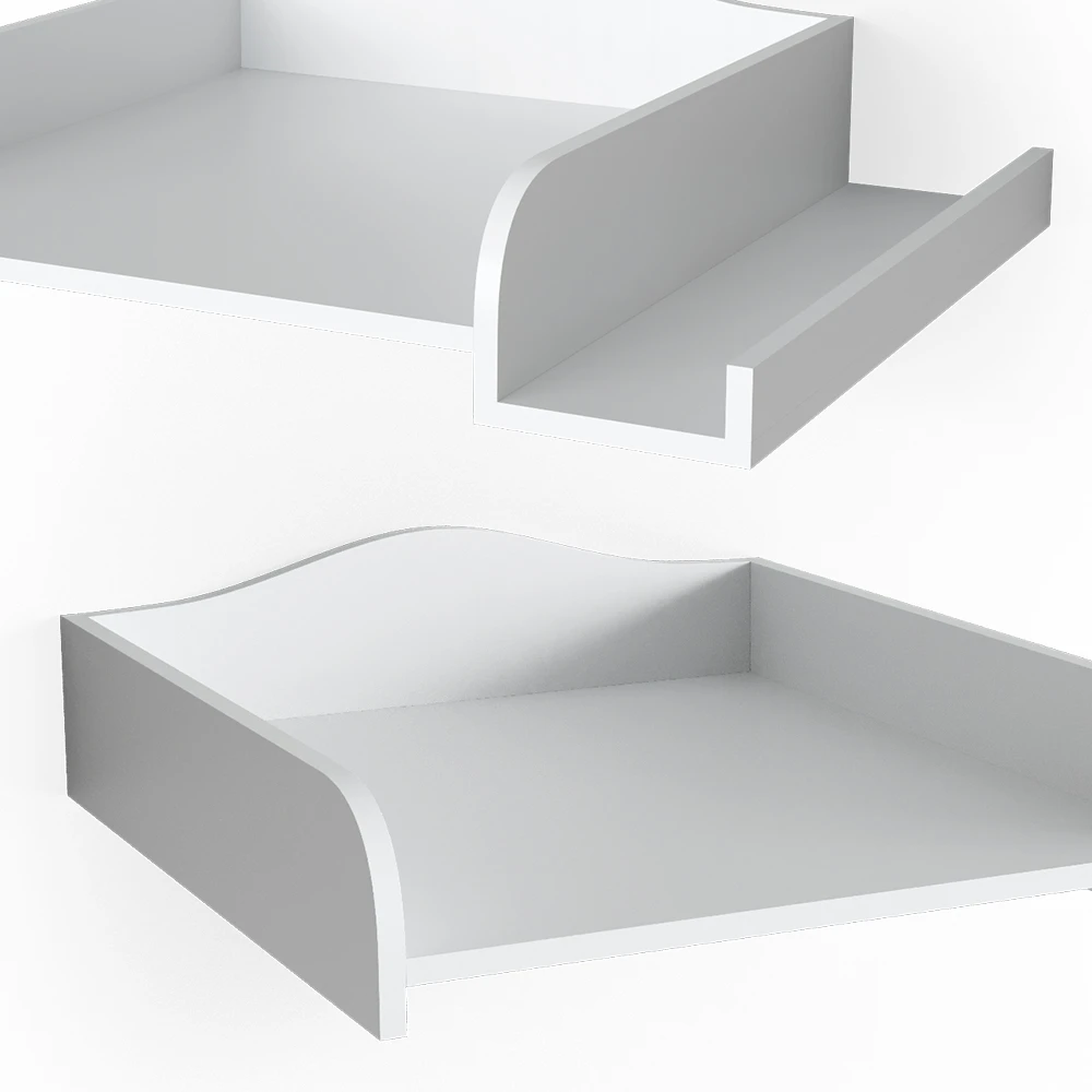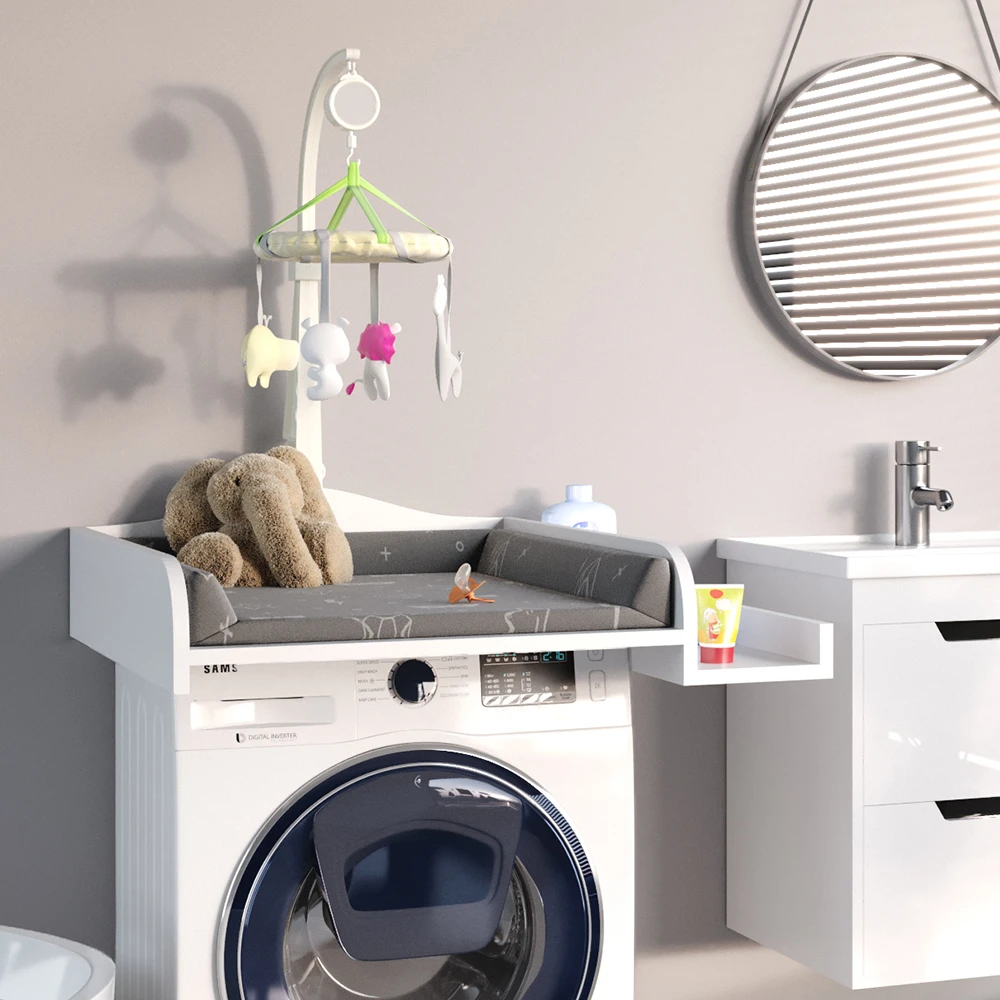 - Der Wickeltischaufsatz in Weiß ist bietet einen Seitenregal, das auf beiden Seiten angebracht werden kann. Zudem sind Überlappungen in der Waschmaschine möglich.