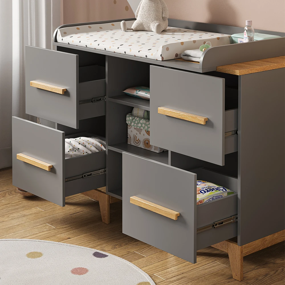 - Der Baby-Wickeltisch besticht durch absolute Vorteile mit 4 Schubladen und 3 offenen Fächern. So haben Sie genug Platz für eine geordnete Aufbewahrung im Kinderzimmer.
