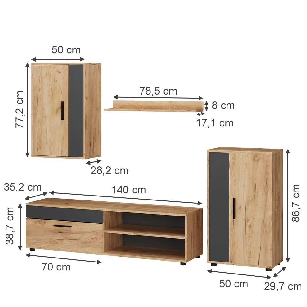 - MATERIAL: Die Wohnzimmerwand besteht aus pflegeleichter Spanplatte 16 mm, mit einer Melaminharzbeschichtung.