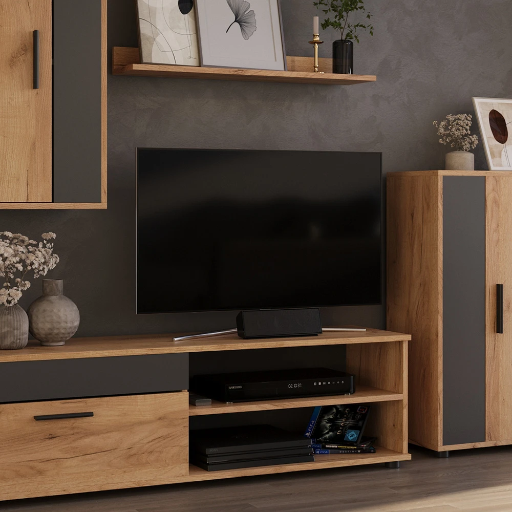 - Die TV-Wand bietet offene und geschlossene Ablagen sowie ausreichend Stauraum, ideal für das Wohnzimmer. Ein funktionales Möbelstück mit praktischen Eigenschaften.